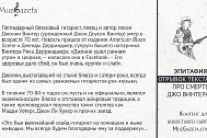 Еще один пример новостного материала для сайта muzgazeta.com. Статья посвящена Джонни Винтеру
