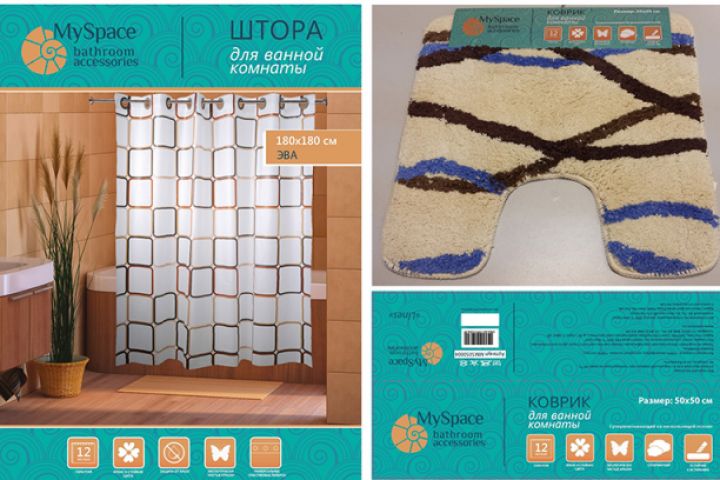 Дизайн упаковки/этикетки аксессуары для ванных комнат. Этикетка для коврика, этикетка для шторы.