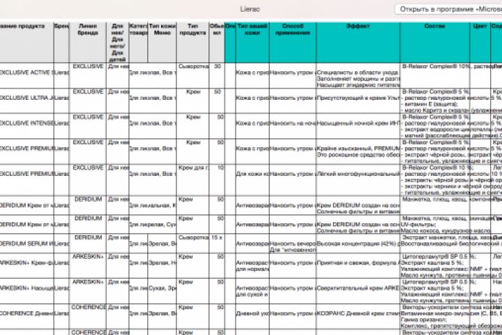 Файл для заливки на сайт интернет-магазина, сделан на основе прайс-листа, сделаны переводы и расшифровки названий. Составлены описания, добавлен состав продукции.