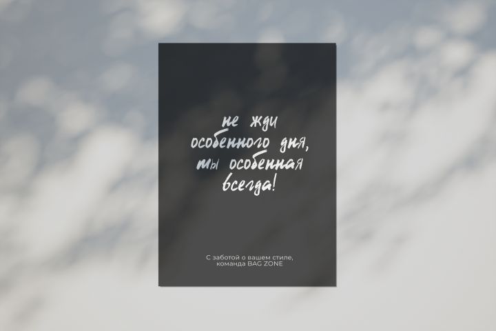 Открытка для бренда сумок. Пожелания клиента - минималистичный стиль. Цвета - белый и серый.