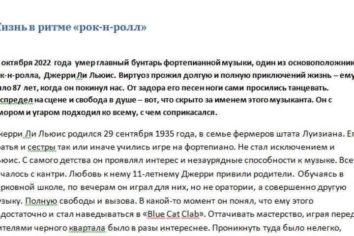 Мною был наисана статья по случаю смерти музыканта Джерри Ли Льюиса. Статья написана на заказ для журнала RockCor