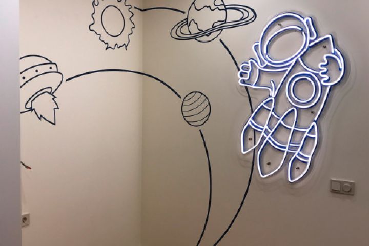 Космонавт, гибкий неон. Подсветка или ночник в детскую комнату. Установлен на дистанционные держатели. Трафареты на стену под покраску.