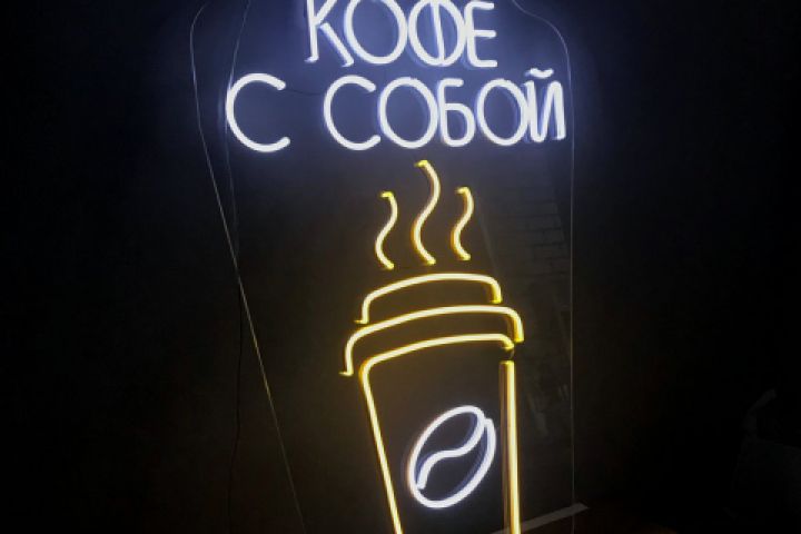 Кофе с собой, гибкий неон. Прозрачная подложка, планируется размещение в окне на тросах.