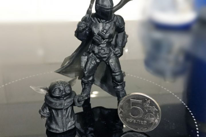 3д печать. Мастер Йода, Мандалорец. На фоне 5 рублевой монеты.