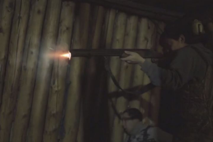 Для художественного фильма добавлено пламя из ствола и блики от вспышки на стене. Изначально актер просто дергал ружьем имитируя выстрел.