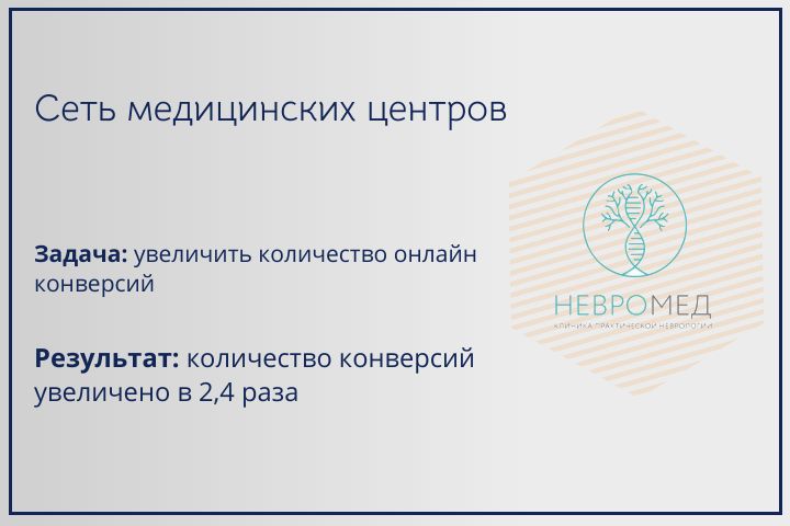 Метрика: количество конверсий Задача: увеличить количество онлайн конверсий Результат: количество конверсий увеличено в 2,4 раза