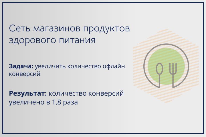 Метрика: количество офлайн конверсий Задача: увеличить количество офлайн конверсий Результат: увеличено количество конверсий в 1,8 раза