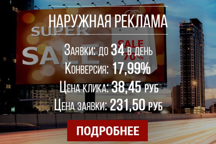 Наружная реклама Заказы: до 32 в день Конверсия: 17,99% Цена клика: 38,45 руб Цена заказа: 231,50 руб