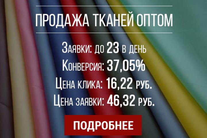 Продажа тканей оптом Заявки/звонки: до 23 в день Конверсия: 37,05% Цена клика: 16,22 руб Цена заявки/звонка: 46,32 руб