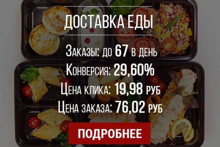 Доставка еды Заказы: до 67 в день Конверсия: 29,60% Цена клика: 19,98 руб Цена заказа: 76,02 руб