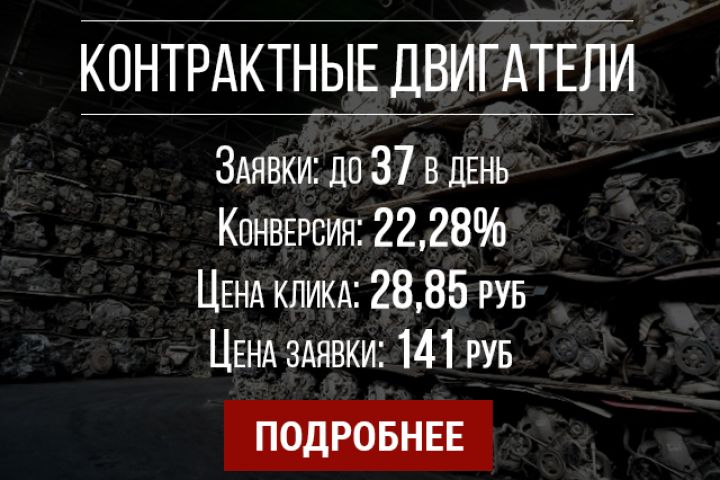 Контрактные двигатели Заказы: до 37 в день Конверсия: 22,28% Цена клика: 28,85 руб Цена заказа: 141 руб