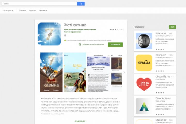 Мобильное приложение "Жетi казына" состоит из 7 разделов «Священная цифра семь», «Семь святынь казахского народа», «Обряд. Традиции, Уклад», «Народная мудрость», «Слово мудреца», «Отчий дом», «Наследие истории» и доступно на казахском и русском языках.