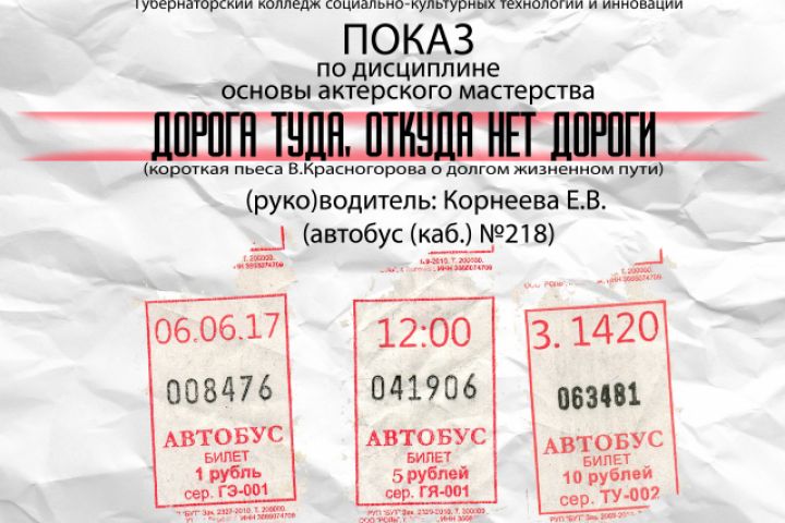 Всё действие пьесы проходило в автобусе, который символизировал человеческую жизнь от рождения до смерти. Поэтому Афишу я решил сделать в виде автобусных билетов, на которых можно увидеть информацию о представлении.