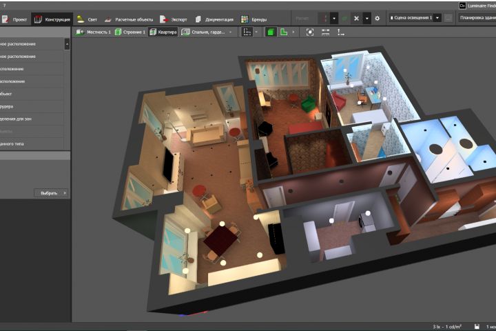 Совсем мельчайшие подробности обстановки квартиры, конечно, нет смысла воспроизводить, поскольку на результаты расчетов они практически не повлияют. Но хотелось передать атмосферу, которую можно воссоздать с применением света и различных объектов, что бы понять какие светильники лучше подойдут в ту или иную комнату.