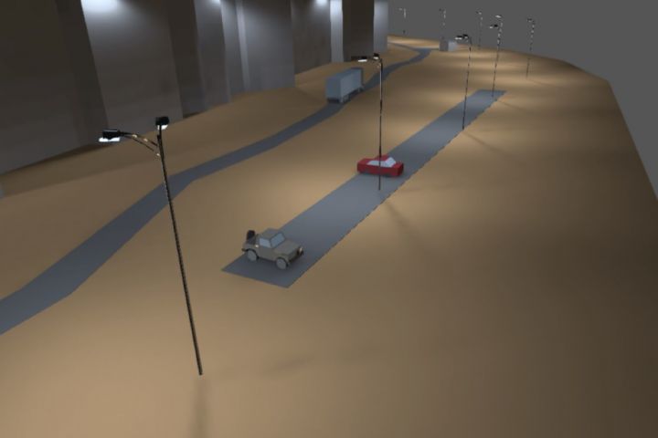 Проект выполнен по ТЗ заказчика, с предоставленным планом территории склада и указанием мест расстановки опор. При визуализации использовались 3д модели автомобилей и самих опор с двухрожковыми консолями. Площадь территории, количество светильников на опорах и на фасаде здания заняли весомое время просчета, но поставленная задача была выполнена. Клиент остался доволен.