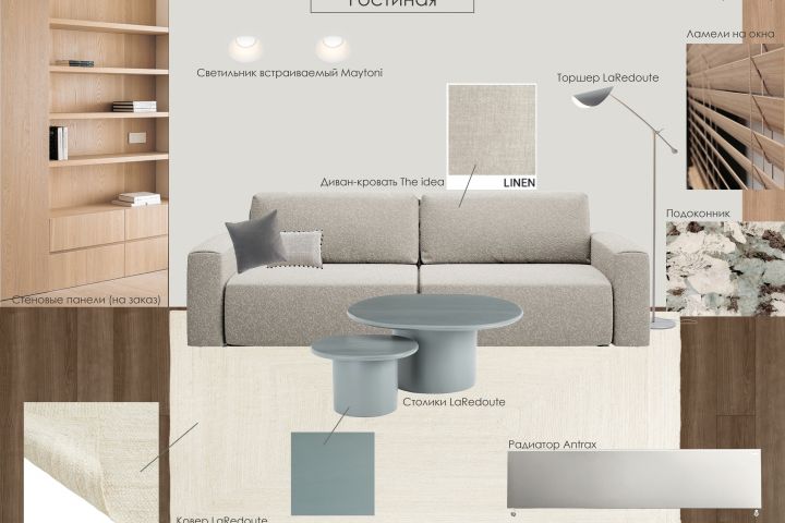 Дерево - это, пожалуй, основной материал, который приходит на ум при мыслях о стиле джапанди. Гостиная в данном проекте выполнена с применением большого количества светлого дерева (стеновые панели, хранение, облицовка оконного откоса), а более темное дерево на полу создает психологически надежную основу и позволяет жильцам ощущать себя в безопасности. Цвет привнесен в интерьер с помощью столиков серо-голубого цвета в сочетании с рисунком натурального камня. Радиатор также является частью дизайна помещения и должен соответствовать ему, поэтому мной выбран минималистичный радиатор с приятными округлыми формами. В дополнительных материалах также прикреплен пример ведомости мебели и освещения по этому помещению.