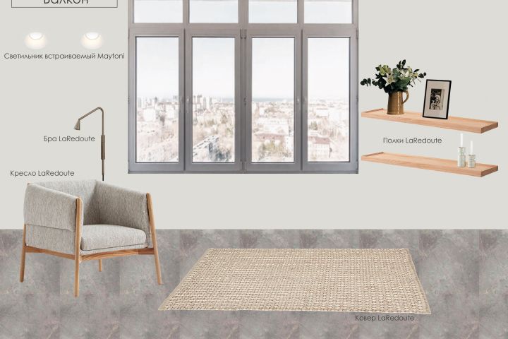 Лично для меня балкон/лоджия являются любимым местом в квартире, где можно остаться наедине с собой или выпить чашку кофе вдвоем, насладиться видом, почитать книгу, поработать или просто подумать. Поэтому в этом проекте на балконе я не стала делать никакого хранения, а оставила только необходимое: уютное кресло, полки для декора или книг, бра для чтения и ковер. Думаю, это идеальное сочетание. В дополнительных материалах также прикреплен пример ведомости мебели и освещения по этому помещению.