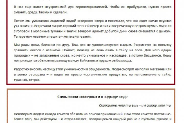 Предложение для рассылки по ресторанам и магазинам натуральных продуктов. От прямых поставщиков - группы охотников и собирателей. Стиль менялся туда-сюда, "Сибирская история" и "Кулинарная притча" писались для этого же проекта.