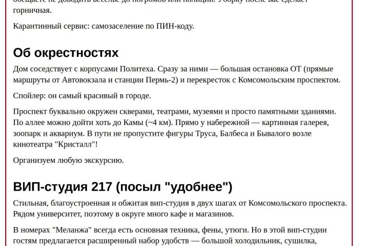 Оформление профиля арендодателя и описания нескольких предлагаемых объектов. Для агрегатора объявлений. Стояло жесткое ограничение по объему текстов.