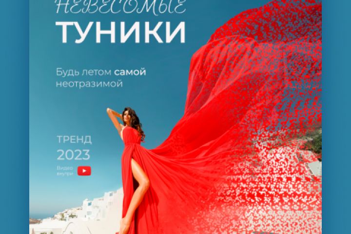 Created an advertising creative with a disintegration effect. The task was to show exactly the decay of the material, so that it was interesting. I chose a contrasting background (finished the details), placed a girl in a spectacular red dress on it, the decay effect adds dynamics to the developing dress. Hierarchical text. In my opinion, it turned out in a summer way.
