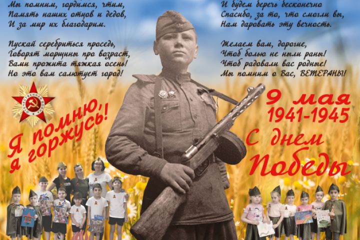 Выполнял заказ сделать плакат формата А3. На плакате обязательно должны быть фотографии детей и воспитателей, лозунг "Я помню Я горжусь" и какое-то стихотворение, посвященной Дню Победы..