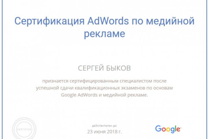 Сертифицированный специалист Google Adwords по медийной рекламе