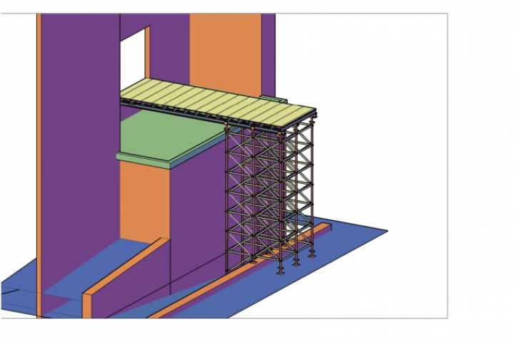 "Стол" из строительных лесов для проезда строительной техники через проем в стене внутрь здания.