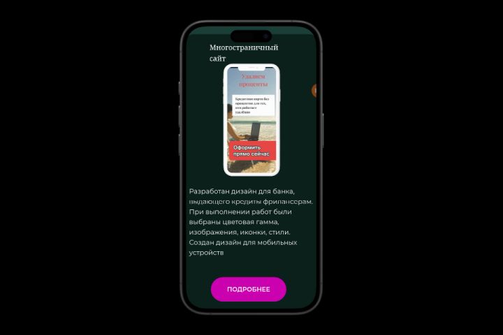 Разработан дизайн для банка, выдающего кредиты фрилансерам. При выполнении работ были выбраны цветовая гамма, изображения, иконки, стили. Создан дизайн для мобильных устройств