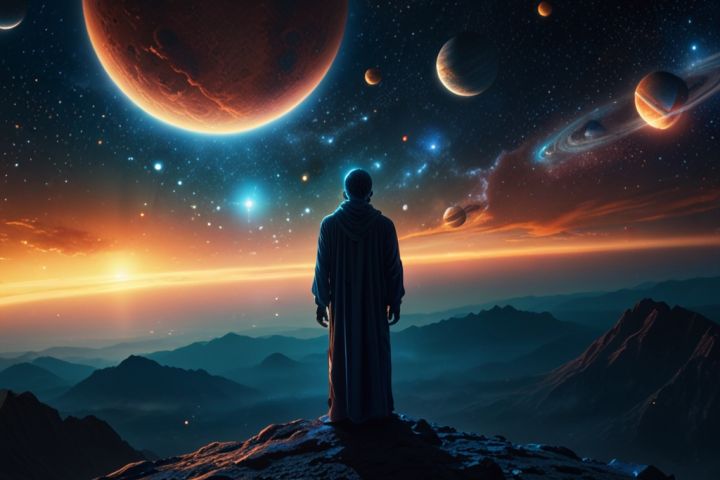 Изображение мудреца стоящего на горе и смотрящего на парад планет