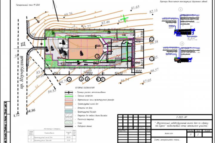 Разработка геплана : посадка на участке , определение вертикальных отметок, схема генплана, выезды, покрытия