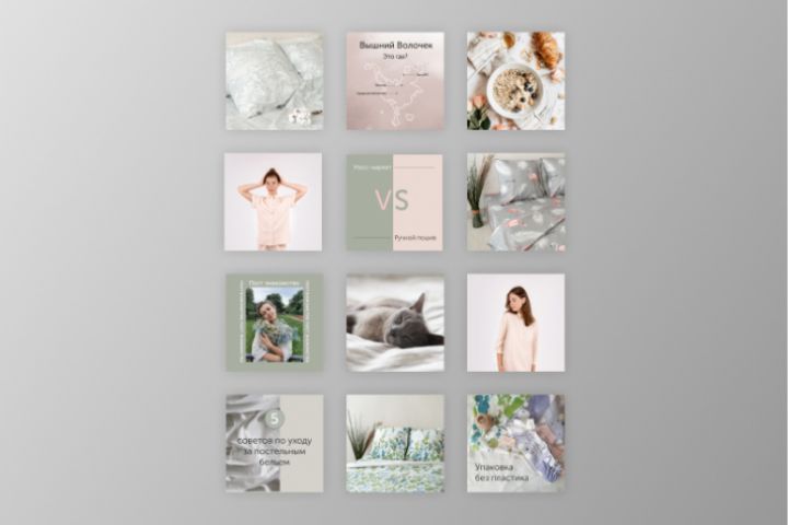 Разработать дизайн ленты для аккаунта по продаже постельного белья и одежды в рамках существующего контент-плана.