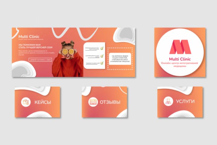 Задача была оформить целиком дизайн, для онлайн центра интегративной медицины. Логотип у компании уже был. Сроки выполнения всей работы : 3 дня.