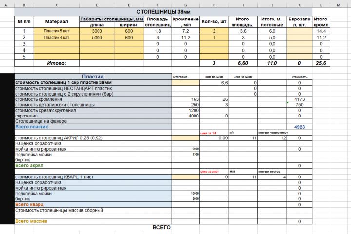 Выполнена автоматизация расчёта комплектующих для кухни в Excel по размерам, выбранным материалам и другим исходным данным. Составление сводной таблицы с использованием макроса.