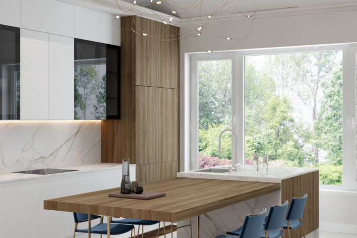 Дизайн проект интерьера для молодой пары в современном стиле с ноткой классики, такое основное пожелание было у заказчиков. Одноэтажный коттедж располагается в черте города и отвечает всем новейшим техническим требованиям. Особенность проекта состоит в достаточно просторной планировке, большой зоны для гостиной и столовой, в центре которых многофункциональный остров и высокий потолок, который позволил разместить объемную дизайнерскую люстру.