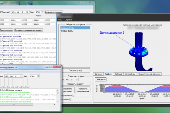 Программное обеспечение состоит из нескольких подпрограмм-серверов. Основной сервер собирает информацию с датчиков по интерфейсам RS485/RS232/Ethernet и записывает в базу данных PostgreSQL. Вспомогательный сервер проводит тестирование системы и обработку ошибок. Программа визуализации отображает оператору измеренную информацию, привязывая её к 3Д моделям элементов судна и отображая графики.