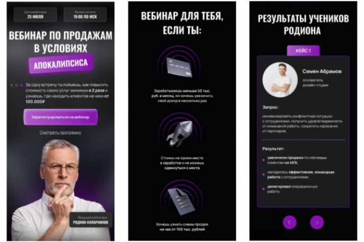 Создал дизайн-макет лендинга вебинара, отрисовал адаптивы сайта для мобильных устройств. Инструмент: Figma