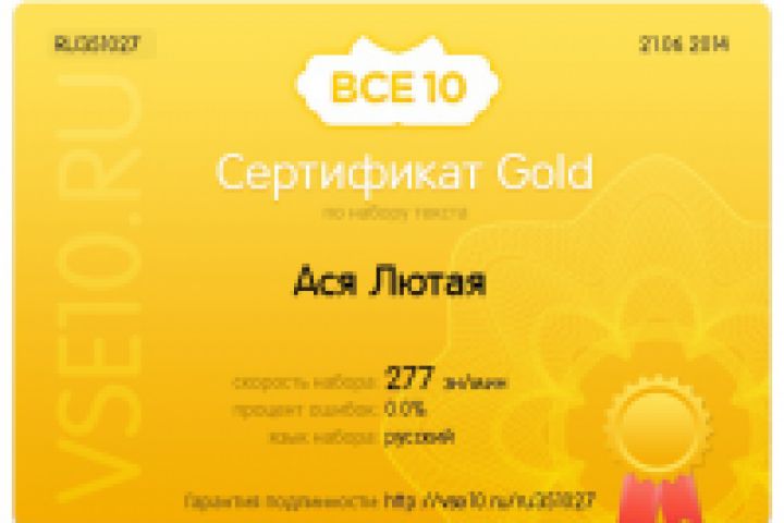 Сертификат Gold (Тест на скорость и грамотность набора текста)