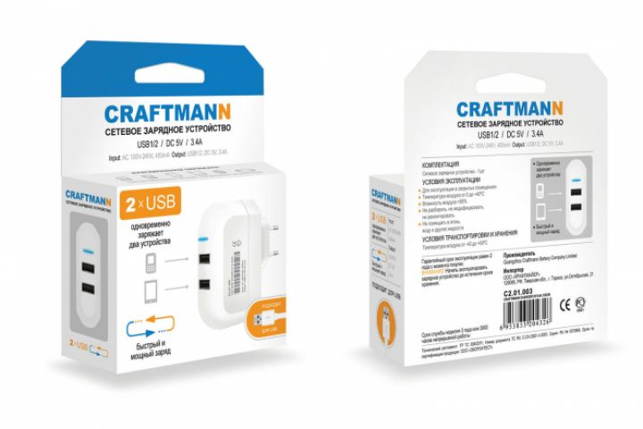 По заказу компании Craftmann был создан дизайн для новой серии зарядных устройств СЗУ Craftmann. Дизайн упаковки был разработан и создан в нескольких видах - это картон и блистерная упаковка. Бренд Craftmann уже имеет свой фирменный стиль, которому необходимо было следовать в рамках этого проекта. Минималистичный, лаконичный и информативный дизайн стали основой этого проекта. Так же в ходе проекта были созданы 3D иллюстрации для каждого зарядного устройства, проводов и разъемов.