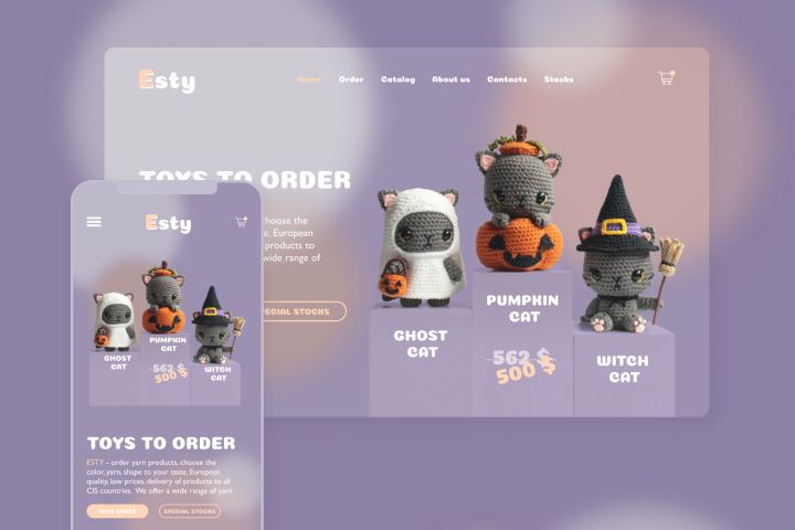 Я очень люблю вязать, особенно игрушки, и моей следующей работой стал магазин вязаных игрушек. Я выбрала очень нежные цвета и тональности, а также мягкие шрифты. Концепция дизайна создавалась пару дней, и я думаю, что оно того стоило