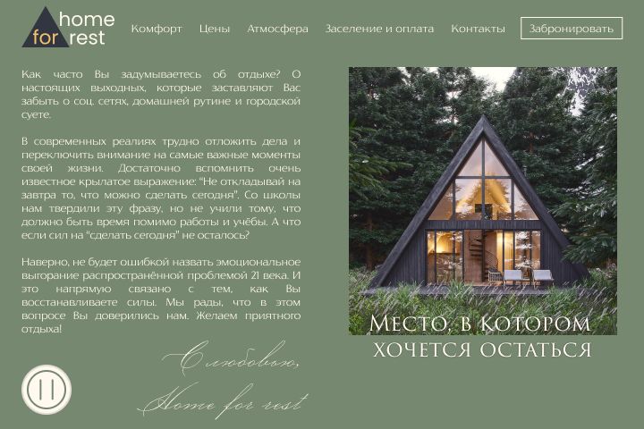 В разделе Главная должна быть краткая информация о загородных домах, основные преимущества и фотографии.