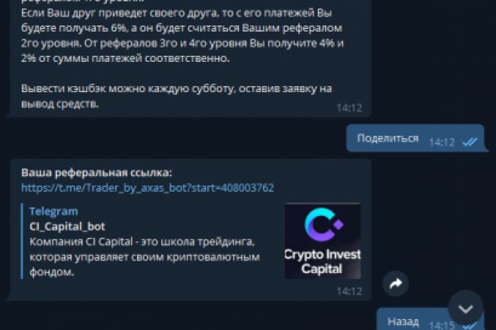 Бот для трейдинговой компании с встроенной оплатой напрямую через бот. Также в нем есть возможность покупки платного канала (это второй бот, который работает в связке).