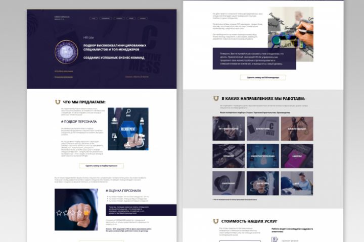 Рекрутинговой компании необходим лендинг, где на одной страницы будут отражены основы деятельности, услуги. Требования к дизайну: строгий, лаконичный стиль, спокойные тона. Цвета: тёмно-миний, золото, серый.