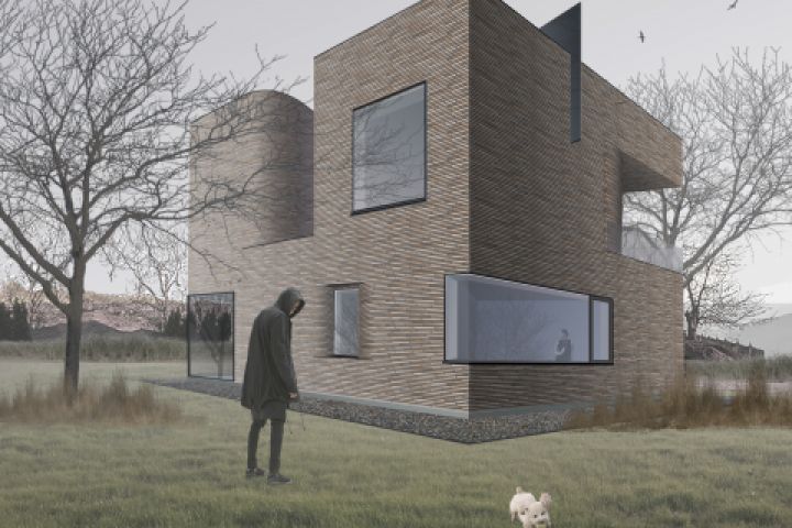 Жилой дом с 2-мя спальнями. Расположение дома и его окружение навеяло образ - дом-крепость - отдельностоящее здание с оборонительной функцией. На данный образ работает и лаконичный кубический объем и открытая фактура кирпича и стены, лишенные декора и обогащенные лишь активной пластикой фасада, в которой проступают мотивы старинных башен.