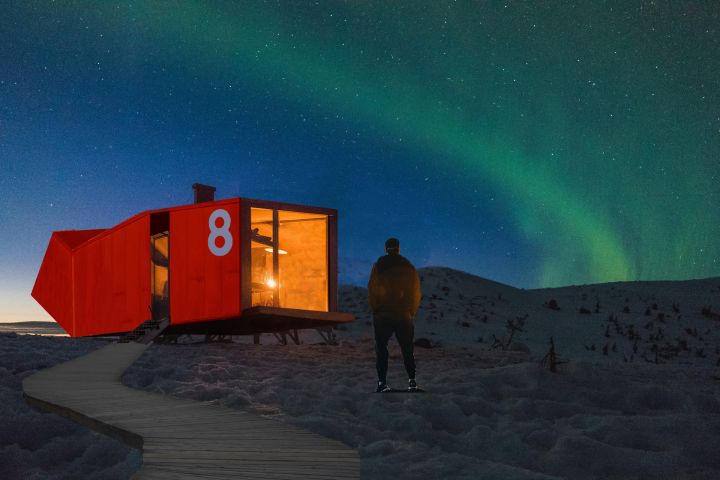 Отель, состоящий из группы отдельностоящих зданий - модулей. Модули полуавтономные, изготовление в Московской области. Модуль рассчитан на проживание 2 человек. Оборудован спальной с наклонным остеклением, санузлом и минигостиной. Облицовка металлические панели, окраска в контрастный цвет.