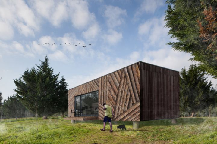 Жилой дом с двумя спальнями, гостиной с кухней, санузлом и кладовой. Габаритные размеры 4х8 метров. Дом облицован горбылём хаотично набранным по главному фасаду. В торце устроены 2 окна в спальные, спрятанные за рейки. Из гостиной обеспечен выход на террасу. Каркас установлен на бетонные пни.