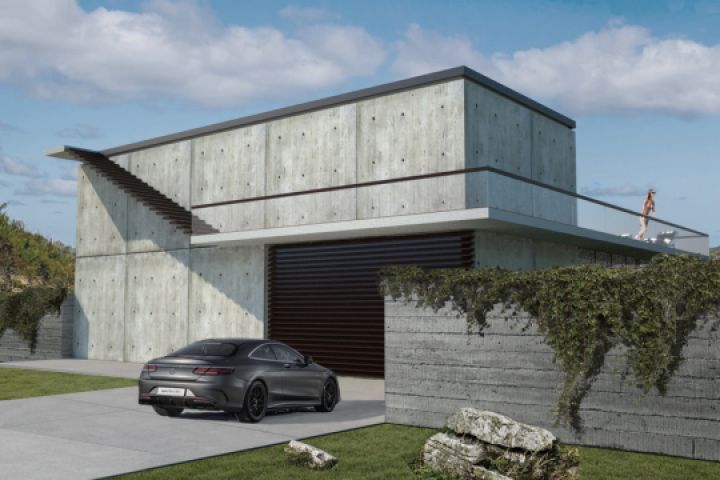 Дом для отдыха в Большом Сочи. Для минимизации шумового воздействия, принято решение отказаться от окон в сторону дороги. Дом максимально открыт к морю. На 1-ом этаже расположена гостиная с террасой, на 2-ом спальня с балконом. Фасад дома выполнен из монолита.