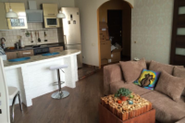 Однокомнатная квартира 43 кв.м. Грамотная Перепланировка квартиры позволила комфортно встроить место для кухни, гардеробные, выделить зону гостиной и отделить спальную зону. В дизайне квартиры добавлены элементы декора, усиливающие ощущение домашнего уюта, такие как расписная барная стойка, камин с дровами, деревянный столик.