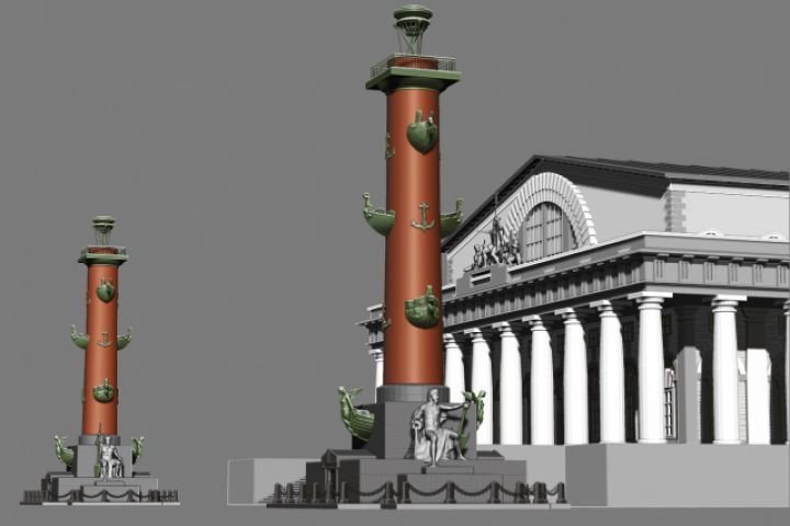 3d модель Биржа и Ростральные колонны, Санкт-Петербург. Архитектор Тома де Томон. Архитектурный ансамбль стрелки Васильевского острова. Модели низкополигональные и высокополигональные.