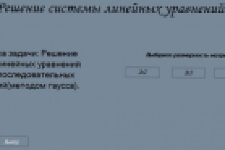 Язык программирования C#. Программа содержащая в себе вычисление систем линейных уравнений. Имеет три варианта построения матрицы 2X2, 3X3, 4X4.Вычисления проводятся по методу Гаусса. Внешний вид работы программы представлен на скриншоте во вложениях. Основным преимуществом является полностью понятный код и отсутствие багов. При желании работу можно приобрести, писать в профиль vk: https://vk.com/ilya_mazin. Так же отвечу на все ваши вопросы по программе.