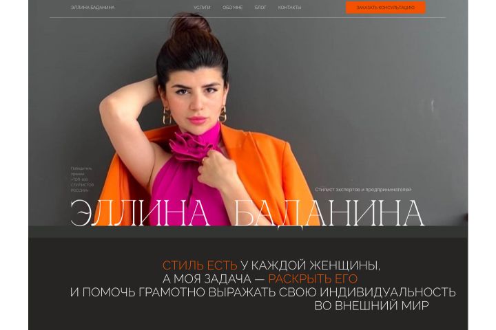 Разработка сайта-визитки для стилиста Эллины Баданиной. Стильный дизайн, яркие фото. Описание услуг.